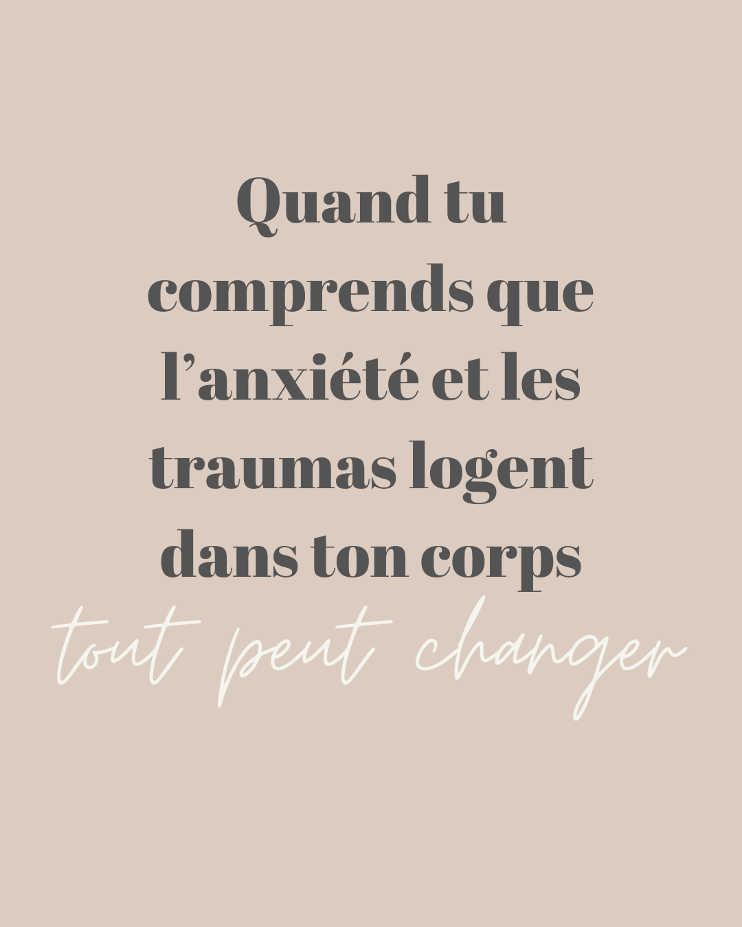 J'ai compris que je vivais avec une anxiété profonde, ancrées depuis des années en moi de façon latente, mais bien réelle. Et ce qui m'a le plus aidé sur ce chemin, c'est d'intégrer que cette anxiété ne prenait pas racine dans mes pensées, que ce n'était pas seulement dans ma tête mais bel et bien ancré dans mon corps.